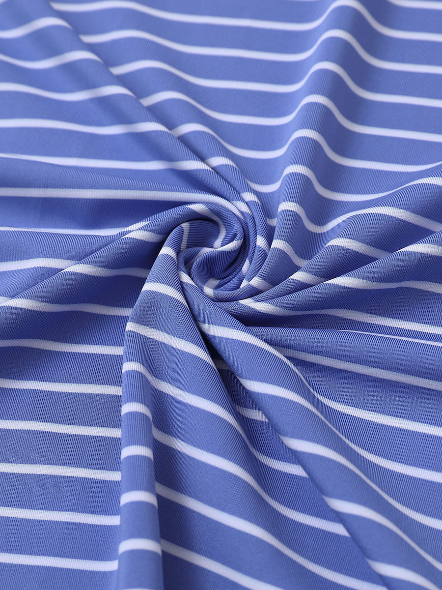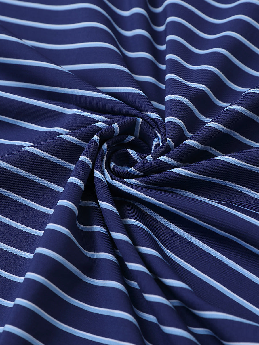 Experience lightweight comfort with moisture-wicking, quick-dry properties, and four-way stretch for enhanced movement. Our men's golf shirt showcases horizontal stripes in two-tone knit, accented by a striking contrast design at the collar and slits, achieving a stylish, unique, and elegant appearance.